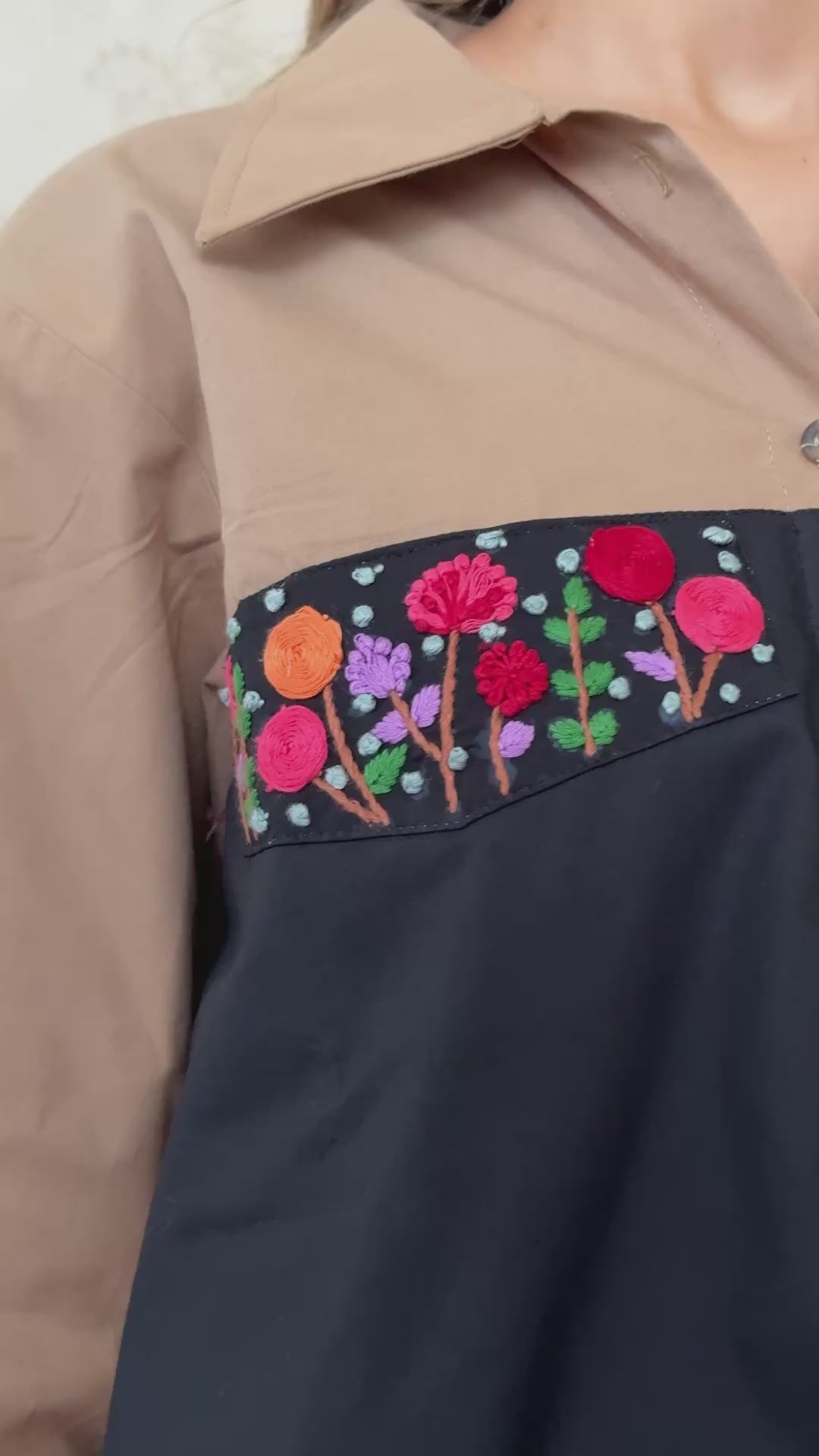 Product Details- A color-blocked shirt in beige and black, featuring intricate hand embroidery across the chest. The floral motifs add elegance to its structured silhouette. Each piece is stitched and embroidered by Dibham artisans in Ludhiana, taking over 12 hours to craft.